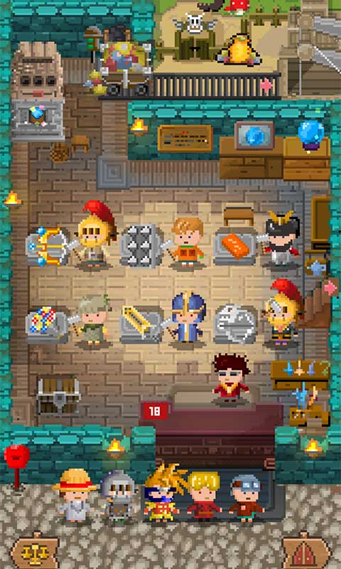 游戏的核心特色在于其高自由度的锻造系统和多元玩法融合。玩家可收集材料研发上千种武器,配方脑洞大开,例如国王权杖=水晶权杖+国王雕像+工匠锤。英雄养成体系同样丰富,每位角色拥有独特的属性成长路径,并可双手持武,搭配补给品形成多维战术。放置玩法允许离线挂机收益,社交功能支持玩家交易或组队挑战。日式像素画风与诙谐剧情设计,为硬核机制增添了轻松氛围。