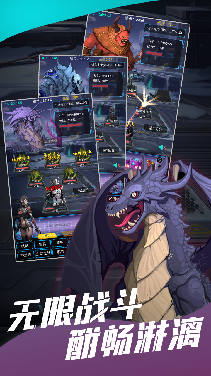 进入游戏后,你会发现自己置身于一个充满无限可能的多元宇宙,包含末世、虫族、修仙等多种主题世界。开局只需选择喜欢的角色,系统就会自动开启挂机战斗模式,连离线时间都会折算成收益哦!前期建议攒元宝升主宰之路,30级后专注刷装备和技能,50级开始挑战BOSS获取高级技能,80级就能搭配出强力技能组合。游戏还贴心地设计了宝箱系统,最多存10个,开箱能爆装备、资源甚至毕业神装,记得定期清理背包!