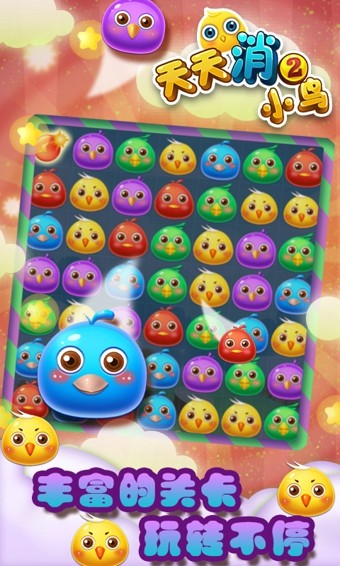 天天消小鸟2是一款极具趣味性和挑战性的休闲益智类消除游戏。玩家将置身于一个色彩斑斓的小鸟世界,游戏画面精美细腻,每一只小鸟都造型可爱、色彩鲜艳。游戏的主要玩法是在规定的区域内,通过交换相邻小鸟的位置,让三个或三个以上相同颜色的小鸟连成一线,从而实现消除。每一次成功消除都会带来一定的积分,游戏的推进,关卡难度逐渐增加,玩家需要不断运用策略和技巧,才能顺利通关。