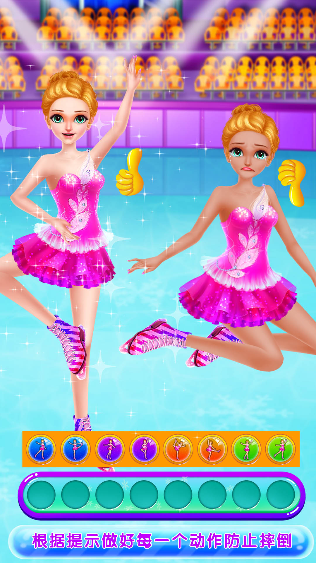 你可以为自己的滑冰公主挑选各式各样的滑冰服,从简约优雅的白色连衣裙到时尚动感的彩色套装,应有尽有。服装的材质、款式、颜色都十分逼真,每一套都能让你的角色散发出不同的魅力。除了滑冰服,你还能搭配各种配饰,比如漂亮的发带、闪亮的耳环、精致的项链等,让角色的形象更加完美。不同的服装和配饰还能为角色带来一定的属性加成,比如某些服装能提升跳跃的高度,某些配饰能增加旋转的稳定性。游戏中的角色表情和动作也非常细腻,当你完成一个高难度动作时,角色会露出自信的笑容,当摔倒时,又会表现出失落的神情,十分生动有趣。