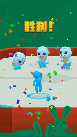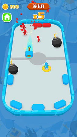 游戏采用俯视角3D战斗模式,玩家需操控橡皮人角色投掷飞盘,利用物理反弹机制击碎敌方身后的建筑物或柱子以取得胜利。玩法分为单人闯关和真人线上PK两种模式,关卡设计随进度难度递增,并融入炸弹、传送门等随机道具增强策略性。操作上仅需拖动瞄准与释放射击两步,但需精准预判角度与力度,考验反应速度与战术思维。
