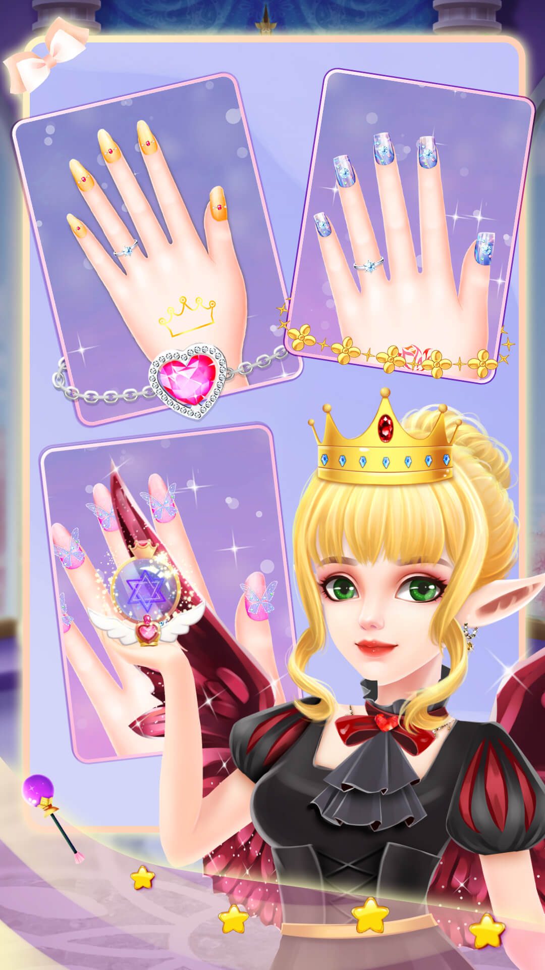 精灵公主美甲设计是一款以美甲艺术为核心的休闲模拟类手机游戏,玩家将扮演美甲师为不同风格的精灵公主设计个性化美甲作品。游戏采用精致的卡通画风,融合了装扮、经营与创意设计元素,提供超过200种美甲工具和装饰素材,包括指甲油、贴纸、亮片、珠宝等,支持自由组合搭配。通过完成美甲订单可解锁新角色与高级装饰,逐步扩展美甲沙龙规模。游戏操作采用直观的触控交互,适合各年龄段玩家体验指尖艺术的乐趣。