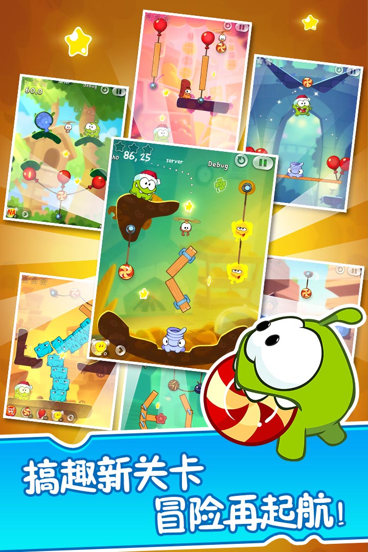 割绳子2是一款风靡全球的益智休闲类手机游戏,作为经典系列的第二部正统续作,在保留了核心物理解谜玩法的基础上,带来了一场全新的精彩美食大冒险。本作不仅继承了前作简单易懂的操作和富有挑战性的关卡设计,更在画面、角色、系统及互动性上进行了全面革新,为不同年龄段的用户提供既能锻炼思维又能带来轻松愉快体验的娱乐内容。游戏围绕着一个名叫OmNom的绿色小怪兽展开,其对糖果的渴望驱动着整个冒险旅程,通过精巧的关卡设计,将烧脑的挑战与轻松可爱的氛围完美融合。
