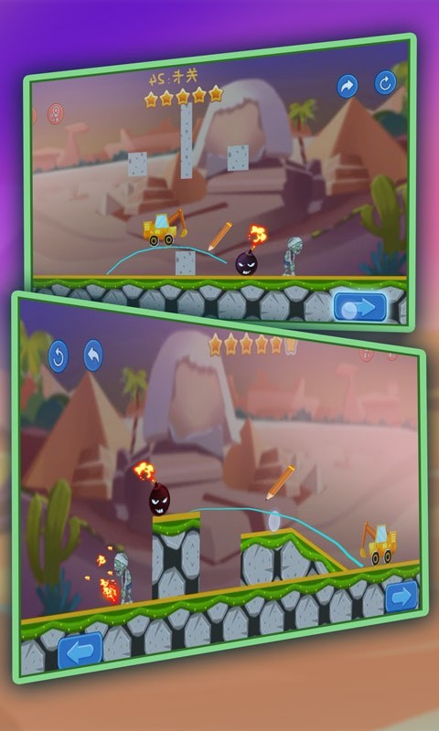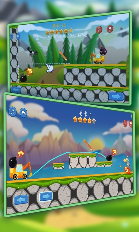 在画线挖掘机中,玩家需要通过手指在屏幕上画出路径,引导挖掘机避开障碍,挖掘宝石并最终达到终点。随着关卡的深入,挑战会逐渐增加,玩家需灵活运用物理原理和道具,通过合理规划路径来解决谜题,挑战自我。