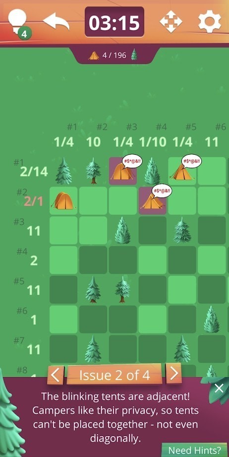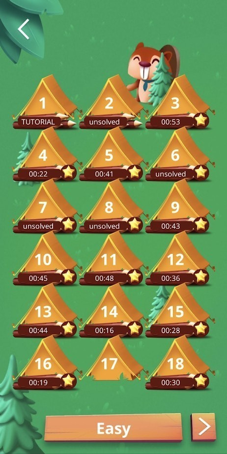帐篷和树采用简洁但充满美感的图形界面,带给玩家清新自然的视觉体验。游戏包含多个等级,难度逐渐增加,玩家需要通过策略和逻辑推理,合理安排每个帐篷的位置。游戏中有提示和反馈系统,帮助玩家在遇到困难时找到解决方案,同时也保留了探索的乐趣。