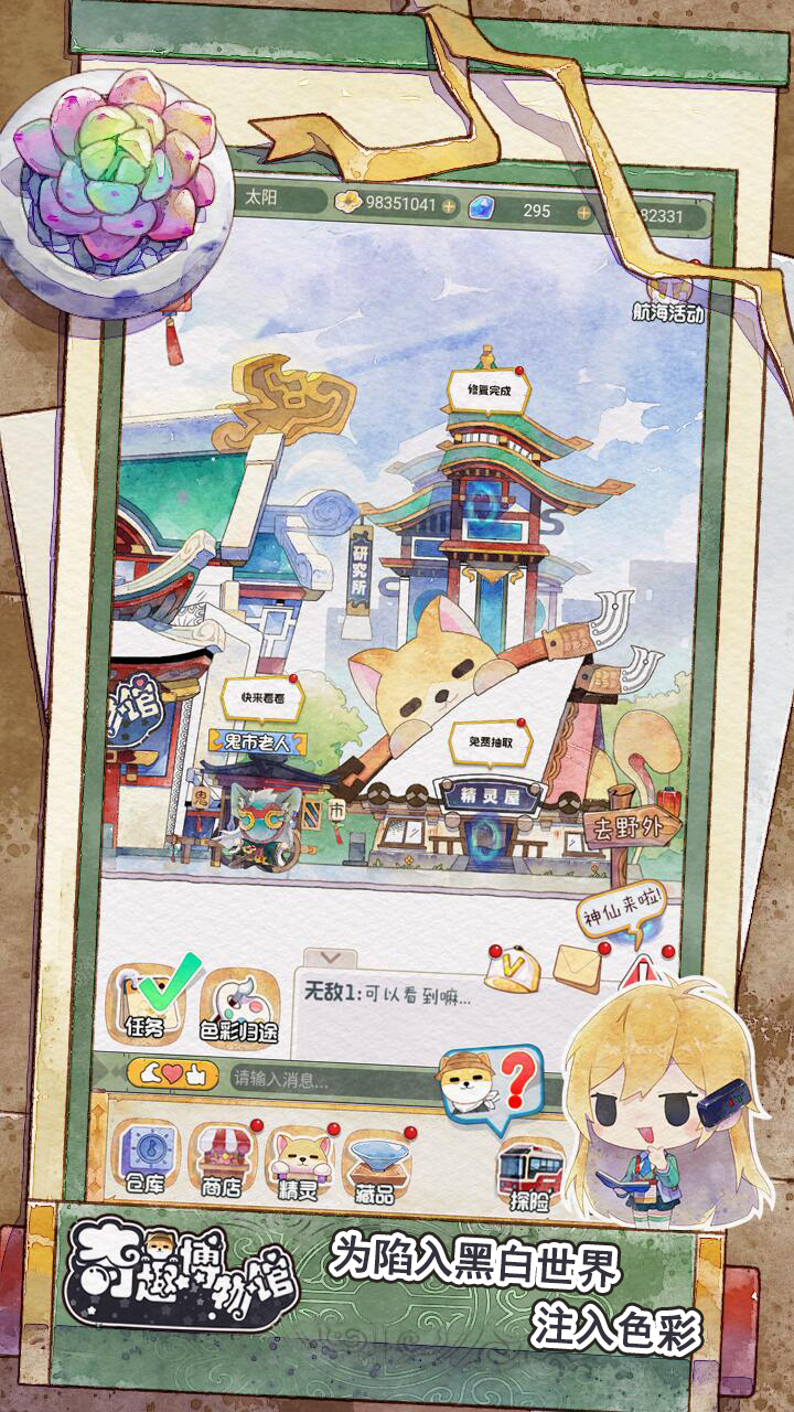 操作简单易上手但玩法有深度,文物羁绊系统让不同展品组合产生特殊效果。知识科普自然融入剧情,了解文物历史的同时还能学习传统色谱。周常活动持续更新,航海玩法能兑换限定道具。内存占用小而画面精致,中国风BGM营造沉浸氛围。精灵培养自由度极高,可以根据喜好打造专属团队,高级精灵还能缩短工作耗时。