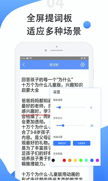通过实时语音识别自动调节滚动速度,确保文稿与口述内容无缝衔接。沉浸式全屏提词板设计有效屏蔽外界干扰,助力专注表达创作。个性化定制体系允许自由设定字体大小颜色及提词板位置,打造专属提词空间。多元化功能组合全面支持悬浮窗提词与横竖屏切换,满足直播带货、课程讲解、演讲培训等不同场景需求。独特的应援灯功能还可在演唱会现场通过滚动字幕营造热烈氛围。