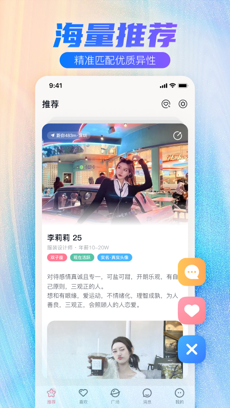 牵手一生是一款专注于婚恋交友的软件,致力于为广大单身人士搭建一个真实、高效、优质的交友平台。大家能遇到和自己志同道合、想要携手走过一生的人。平台汇聚了来自五湖四海的单身男女,涵盖了不同的年龄层次、职业背景和兴趣爱好,为大家提供了丰富多样的选择。无论是想寻找灵魂伴侣,还是希望开启一段浪漫的恋情,都能在这个平台上找到属于自己的缘分。