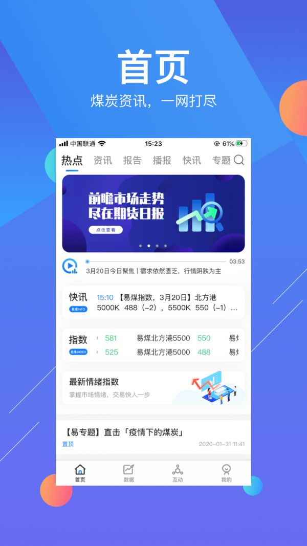 2.易煤资讯app 是一个功能全面、实用性强、用户体验优良的行业信息服务平台。无论您是煤炭行业的从业者还是相关行业的观察者,这款应用都将是您不可多得的辅助工具。在这个竞争激烈的行业中,拥有易煤资讯就是拥有了一副更为锐利的眼睛和更快的信息处理能力。