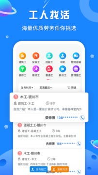 该平台将建筑行业的招工需求与工人资源整合,提供全职、兼职、家政服务、装修工程等多类型岗位。用户可基于地理位置筛选附近工作,或按工种分类精准搜索。雇主发布招工信息时需填写人数、经验要求、薪资等细节,工人端则可通过一键申请接单。软件内置电话沟通功能,支持双方直接联系,同时提供实名认证、评价系统等保障措施,确保信息真实性与交易安全。平台还新增记工记账功能,帮助工人管理工时与收入。