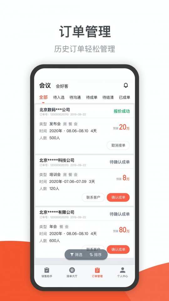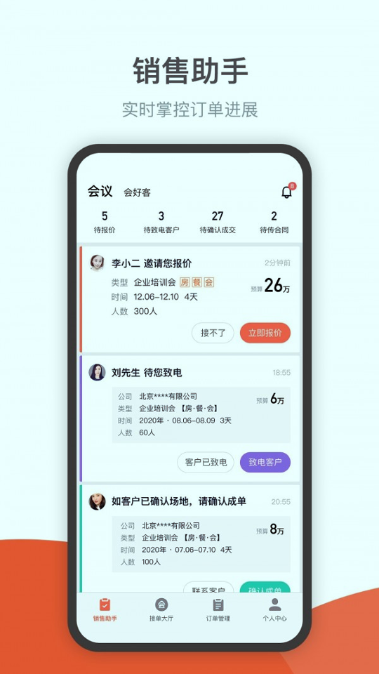 该工具核心功能涵盖销售助手、接单报价、接单大厅和订单管理四大模块,形成完整的业务闭环。用户可通过多维度的销售线索查找与提醒功能实时获取潜在客户需求,并利用内置报价系统快速生成专业方案。平台接单大厅集中展示待处理订单,支持按场地类型、预算等条件筛选,而订单管理模块则提供从预订到执行的全程跟踪服务。全国超过11万家企业及9万家酒店已接入该系统,每月平台成交会议超过3700场,验证了其商业价值与可靠性。