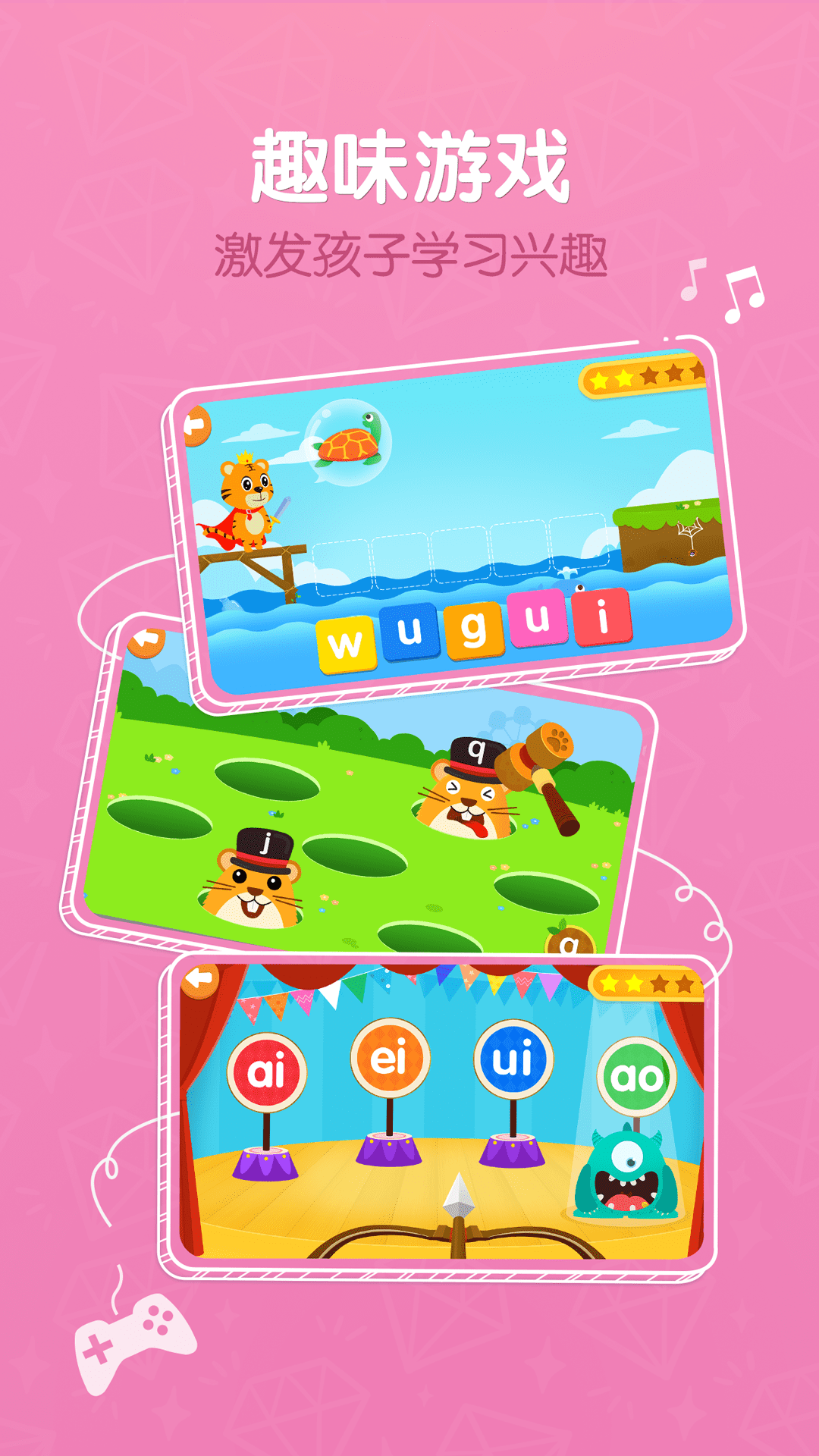 该启蒙产品采用分层递进的学习结构,设计有6个主题单元。每个拼音字母均通过认、说、写、练四个环节展开教学:认读环节结合动画场景展示字形与发音关联;发音环节通过麦克风互动鼓励儿童跟读;书写环节配备动态笔顺演示和描红功能;巩固环节则通过30余种互动游戏进行知识强化。学习过程中穿插拼图、记忆卡片等趣味活动,帮助儿童在无压力环境中掌握拼音拼读规律。