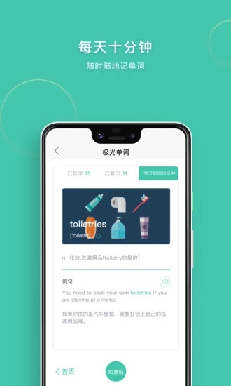 极光单词是一款让你的英语学习变得轻松又高效的贴心小助手。ta采用了科学记忆方法与丰富学习资源相结合的方式,为你量身定制个性化的单词学习计划。通过智能安排学习节奏,帮助你在不知不觉中牢固掌握海量词汇,让背单词这件事变得像玩游戏一样充满乐趣。不论是准备考试还是日常提升,这位小伙伴都能陪伴你稳步成长。