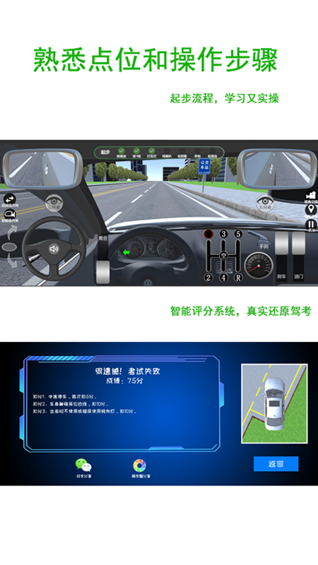 这款应用有几个非常实用的特色功能,能显著提升我们的练习效率。一是灵活的视角切换,支持第一人称、第三人称和俯视视角自由切换,练车时用横屏,刷题时用竖屏,操作非常顺畅。二是独具匠心的趣味回放功能,练习结束后可以完整回放自己的操作过程,特别是失败时能清楚看到问题出在哪一个环节,并且可以直接调回到失败前重试,节省了大量摸索时间。三是提供了AI教练全程陪伴,在练习中一旦出现压线、熄火或忘记打转向灯等错误,会立即得到语音提示和反馈。练习结束后还能生成详细的报告,标注扣分点和行驶轨迹图,让提升方向一目了然。