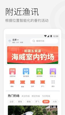 1.gps钓点定位:准确的gps定位帮助用户快速找到周围的钓点,同时显示钓点的详细信息,如钓点类型、主要鱼种、用户评价等。
