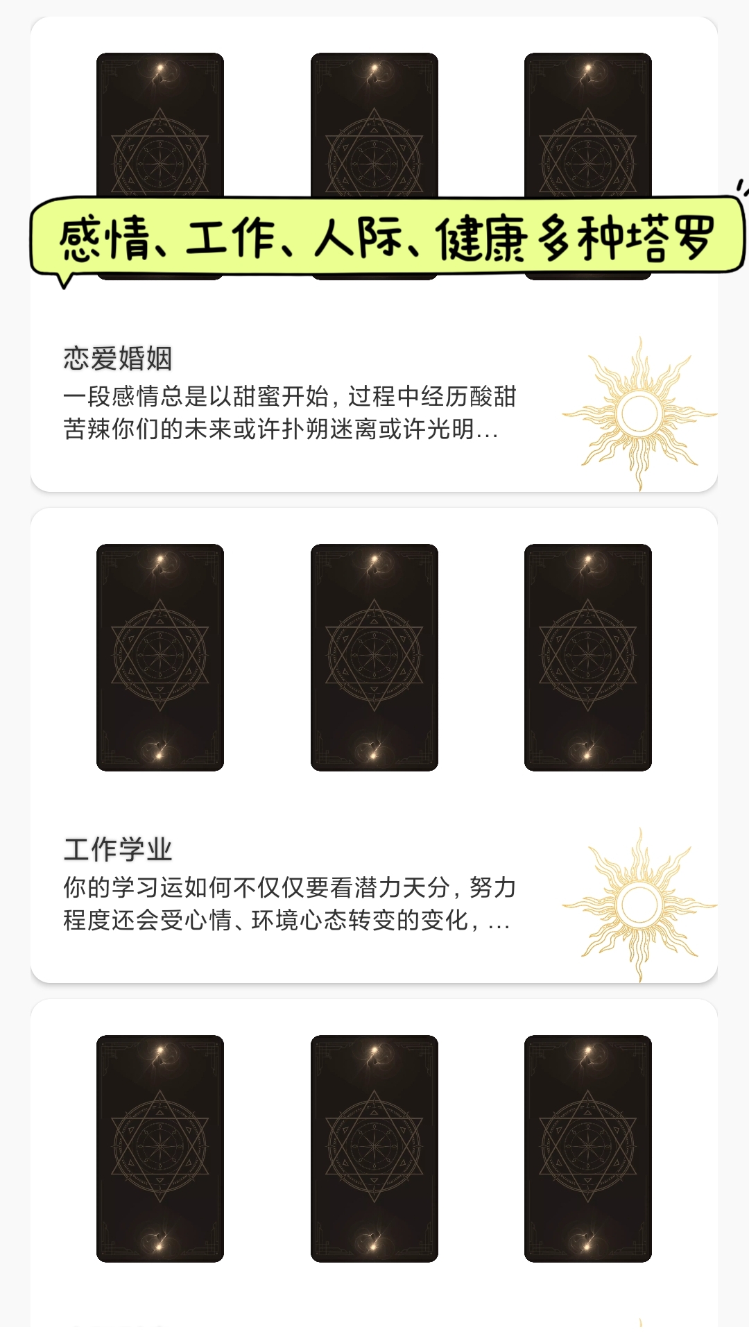 即使是初次使用的用户,也能轻松上手。软件的页面布局清晰,各个功能模块一目了然,用户可以快速找到自己想要使用的功能。它的塔罗牌占卜过程非常流畅,抽牌动画逼真,给用户带来身临其境的体验。另一个亮点是其解读内容的专业性和准确性。软件的塔罗牌解读和星座运势分析都是由专业的神秘学研究者和占星师团队编写,他们结合了多年的研究和实践经验,为用户提供最准确、最有价值的信息。软件会不断更新解读内容,以适应不同时期的星象变化和社会环境的影响。软件还支持分享功能,用户可以将自己的占卜结果和星座运势分享到社交媒体上,与朋友一起交流和探讨,增加了软件的趣味性和互动性。