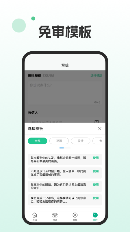 打开这个小工具,你会发现里面藏着不少实用功能。编辑短信时可以自由选择是否加密,还能直接套用丰富的现成模板,省去了自己斟词酌句的麻烦。如果需要更人性化的沟通方式,可以启用人工传话功能,由专业专员帮你把生硬的文字转化成温暖的表达。匿名电话功能更是贴心,每次拨打都会显示随机生成的国内手机号码,24小时随用随充,连烦人的充值门槛都没有设置。遇到节日或特殊日子时,内置的祝福模板直接选用就能免审核发送,再也不用担心短信字数限制打断你的真情流露。通讯录管理也很方便,支持云端同步,重要联系人再也不会丢失。