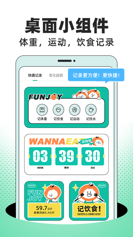 最让人心动的是那只可爱的橘子头套猫咪,会一直陪伴你的减肥旅程。可以自由切换减肥心情,无论是开心减肥还是偶尔的自暴自弃,大橘都会帮你记录下来。个性化的饮水提醒功能,通过简单直观的数帮助你轻松拿捏住每天的八杯水。精美的桌面小组件配上大橘子的超萌模样,让你随时都能看到食谱提醒、快捷记录和数据变化趋势,打造独一无二的桌面设置。