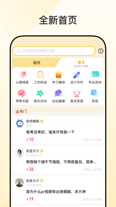 打开请做,你会看到琳琅满目的服务项目,从热门推荐到具体分类一应俱全。想要找服务时,只需在搜索框输入关键词,相关资源就会立刻呈现。每个服务提供者都有详细的信息和真实评价,让你能放心选择。需要发布需求时,简单描述具体要求,很快就会有擅长这个领域的人来联系。整个过程完全线上完成,不受地域限制,让你轻松连接到全国各地的高手。