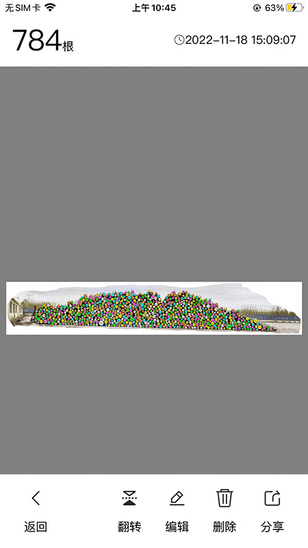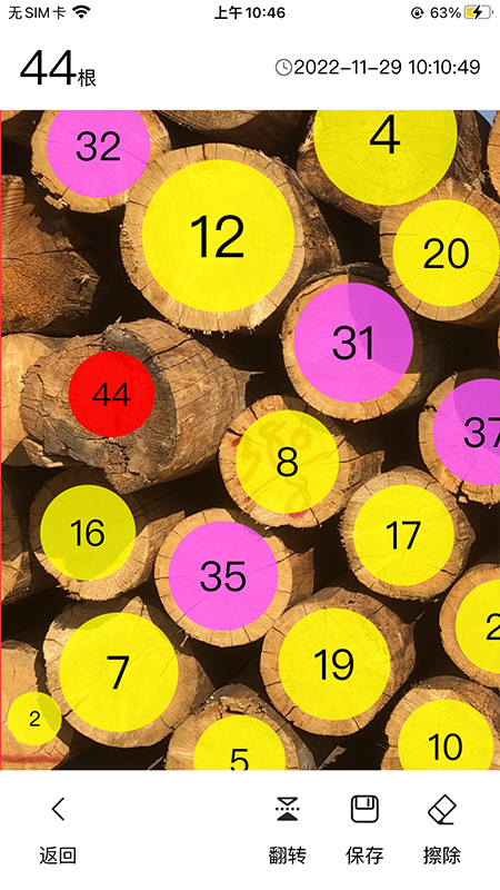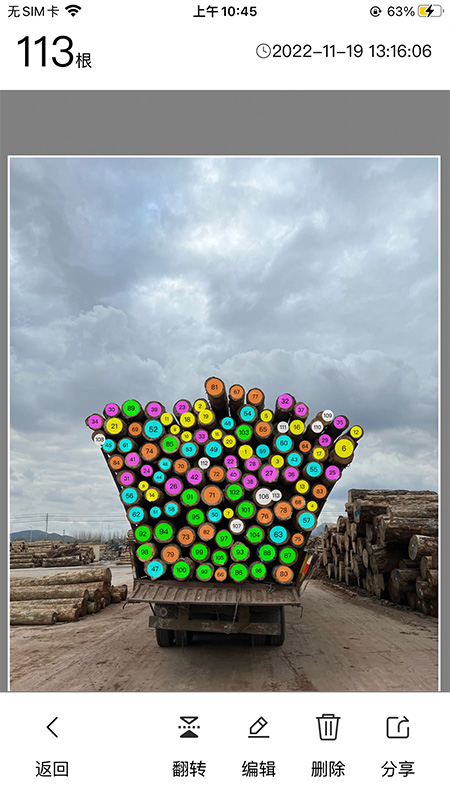 核心功能是拍照自动计数,只需打开产品对准需要统计的物品,系统会通过智能算法识别画面中的物体轮廓并标注序号,最终生成总数统计。支持连续拍摄、成组计数、循环计数等多种计数模式,满足不同场景下的计数需求。对于堆叠摆放的物体,产品能通过三维建模算法估算被遮挡部分的数量,在盘点仓库货物时特别实用。操作界面极其简洁,主页面只有拍照按钮和功能入口,拍摄后可以手动调整识别区域或修正计数结果。长垛或者原木铺平时,可使用视频计数功能,通过人工智能算法自动拼接视频帧,将几分钟的视频变成完整的全景图片,从而达到准确计算。
