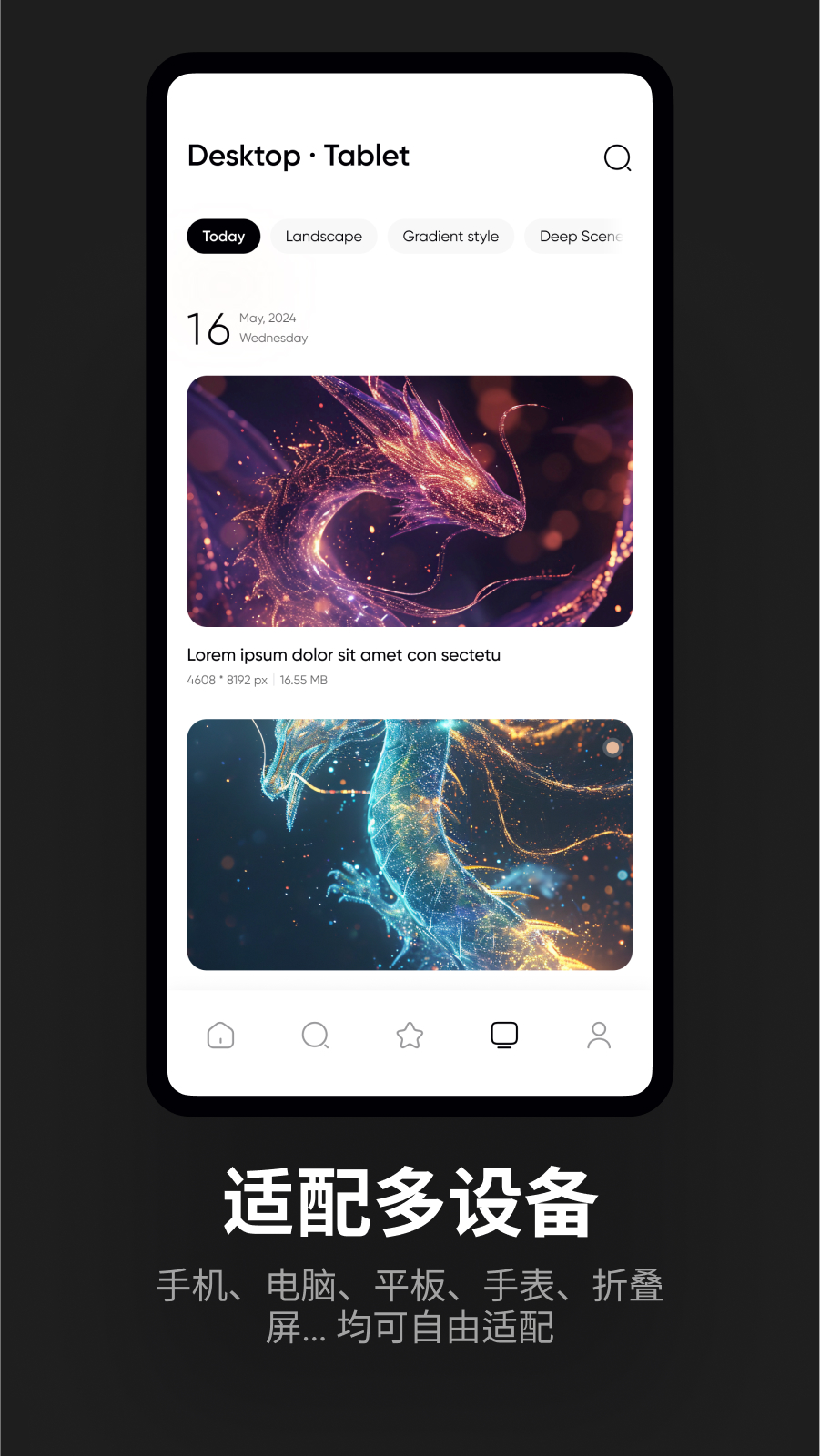 最吸引人的是AI创作的独特性,每张壁纸都是通过智能算法生成的原创作品,完全不用担心会撞款。每日更新的壁纸杂志特别有意思,每期都有特定主题和创作故事,比如敦煌飞天与未来机甲这样的跨界组合,在欣赏美图的同时还能了解背后的设计灵感。超高清画质表现令人印象深刻,放大查看时连笔触纹理都清晰可见。多设备适配做得非常到位,从折叠屏到智能手表都能完美匹配,横版图片资源也专门为平板和电脑做了优化。