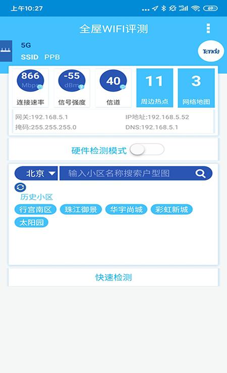 该工具主要提供基于真实户型图的wifi质量检测能力。在使用前,可以从丰富的户型图库中选择或上报自家户型,作为检测的基准平面图。检测过程支持多点位一键检测,无需在每个位置进行复杂的单独设置。执行检测后,工具会实时收集连接速率、信号强度、信道占用情况等关键网络参数。所有检测数据会被系统自动整合与分析,并形成一份详尽的可视化质量检测报告。这份报告清晰标注了不同区域的信号强度与网络速度,如同一目了然的全屋强度图纸,使家庭网络的优劣分布得以直观呈现。整个流程设计简化专业检测的门槛,使家庭wifi评测变得像日常使用一样便捷。